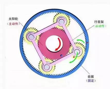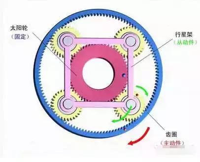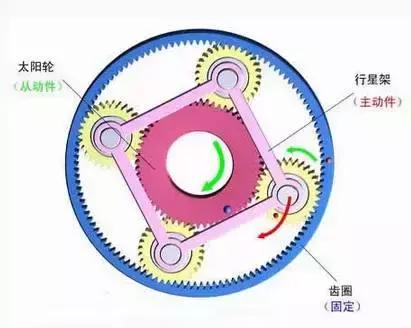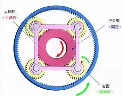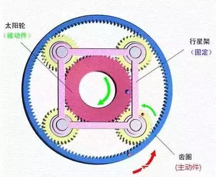 當把行星架和齒圈結合為一體作為主動件,太陽輪為被動件或者把太陽輪和行星架結合為一體作為主動件,齒圈作為被動件的運動情況。從圖例1我們可以看出,行星齒輪間沒有相對運動,作為一個整體運轉,傳動比為1,轉向相同。