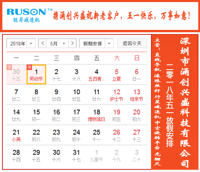 一、放假時(shí)間為2018年4月29日至2018年5月1日,共3天,于2018年5月2日正式上班。上班后,我公司的產(chǎn)品(直線(xiàn)導(dǎo)軌、滾珠絲桿、行星減速機(jī)、中空平臺(tái)、光柵尺)將正常供貨!