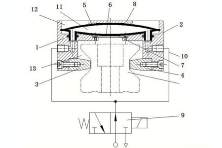 1、右座體 2、左鎖緊片 3、右鎖緊片 4、上彈簧鋼片 5、下彈簧鋼片 6、彈簧片 7、限位凸臺 8 和電磁閥 9,左座體和右座體相對鏡像設(shè)置,左座體和右座體上方中心設(shè)有限位凸臺 8,左座體 1 和右座體 2 經(jīng)彈簧片 7 固定連接,左座體 1 和右座體 2 上端中心設(shè)有彈簧鋼片腔 12,下端中心設(shè)有線軌滑塊移動腔 13,下端一側(cè)與左鎖緊片 3固定連接,另一側(cè)與右鎖緊片 4固定連接,左座體 1 和右座體 2 外側(cè)壁上分別設(shè)有氣體通道 10,限位凸臺分別與左座體和右座體固定連接,左鎖緊片 3 和右鎖緊片 4 相對設(shè)置,以利于對線軌滑塊進(jìn)行夾緊制動,彈簧鋼片腔內(nèi)設(shè)有由上彈簧鋼片 5 和下彈簧鋼片 6 周邊密封連接而形成彈簧伸縮囊 11,彈簧伸縮囊 11 一端與左座體 1 固定連接,另一端與右座體 2 固定連接,上端與限位凸臺 8 相抵觸,下端與彈簧片 7 相抵觸,彈簧伸縮囊 11 上設(shè)有壓縮空氣出入口,氣體通道 10 一端與壓縮空氣出入口相連通,另一端與氣源相連通,以使彈簧伸縮囊 11內(nèi)填充有壓力氣體,氣體通道 10上設(shè)有電磁閥 9,以利于通過電磁閥 9自動控制彈簧伸縮囊 11 內(nèi)的氣體含量,使彈簧伸縮囊 11 帶動左座體 1 和右座體 2 相對移動或相背移動,進(jìn)而實(shí)現(xiàn)自動調(diào)整左鎖緊片 3 和右鎖緊片 4 對線軌滑塊進(jìn)行自動夾緊制動的作用。