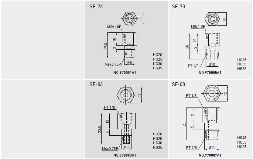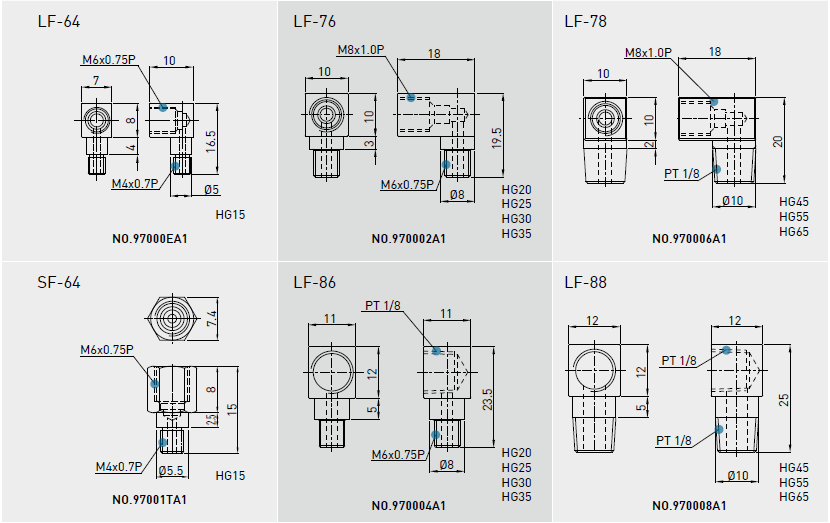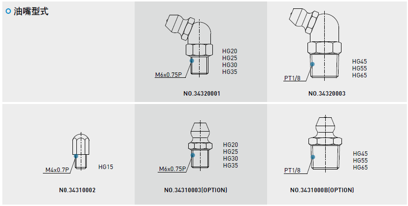建議使用油黏滯度約為30~150cSt之潤滑油潤滑直線導軌,客戶可先跟我們說明需要使用油潤滑,出貨之直線導軌將不會封入潤滑油脂。油管接頭型式
