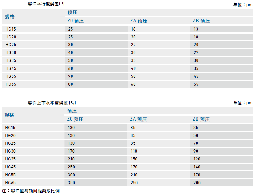 HG系列為圓弧兩點接觸式直線導軌,其自動調(diào)心的特性可以吸收安裝面的些許誤差而不影響直線運動的順暢性;下表中注明了安裝平面的容許誤差值: