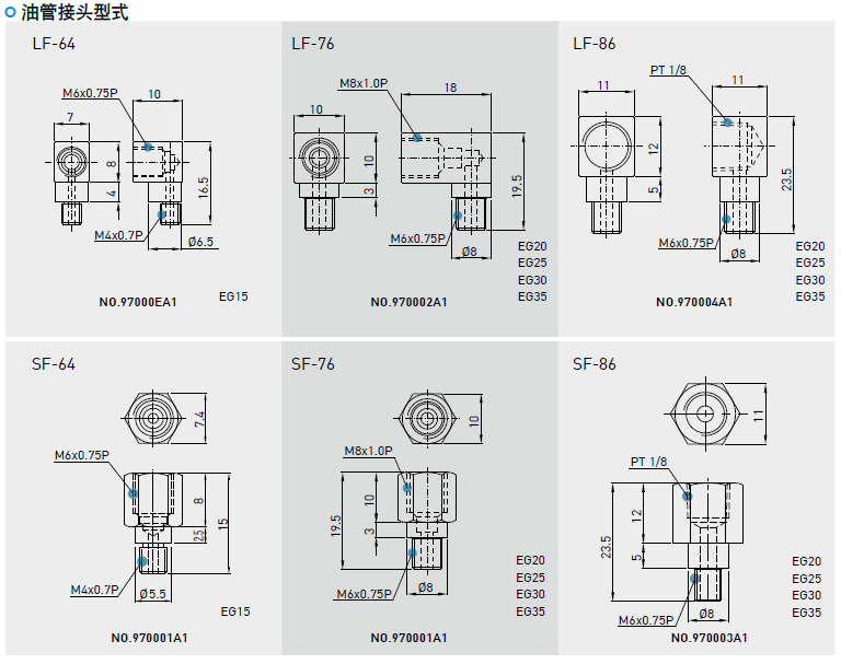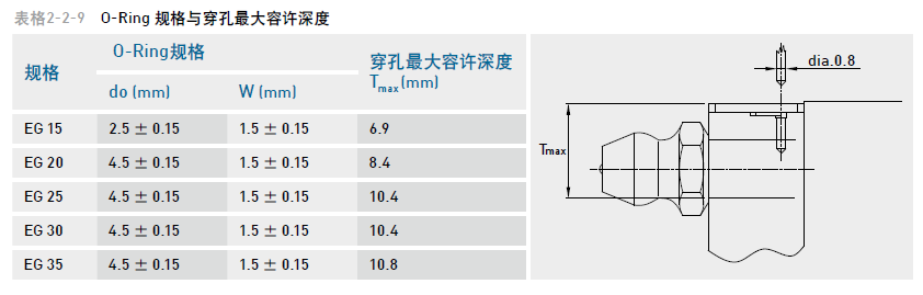 依客戶需要在滑塊前端或后端裝上油嘴以供手動打油,EG系列特別在端蓋側(cè)邊預(yù)留側(cè)油孔位置安裝油嘴(一般為直油嘴),提供側(cè)向打油,側(cè)向打油的位置建議在非側(cè)基準(zhǔn)邊,但若有特殊需要亦可放在側(cè)基準(zhǔn)邊。客戶如有上述側(cè)向打油需求請與我們聯(lián)絡(luò)。EG系列在端蓋頂端亦預(yù)留上油孔位置,客戶若欲從端蓋上方供油,須使用直徑0.8mm的金屬針以預(yù)熱的方式,在指定位置將上油孔穿通,再將密封環(huán)安裝于凹處即可,避免使用鉆頭穿通上油孔,碎屑有污染油道的危險。使用接管方式自動供潤滑油脂之直線導(dǎo)軌,則可依連接管型式選用安裝油管接頭。