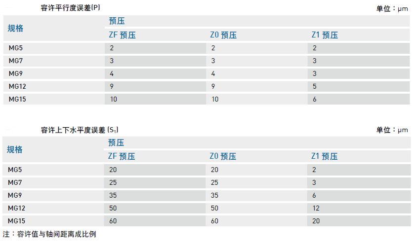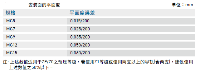 微型滾珠直線導軌MG系列安裝平面誤差對照表