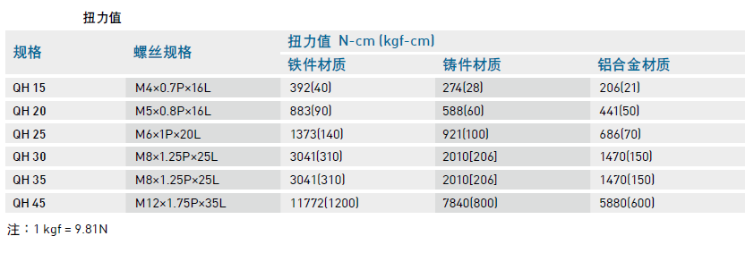 安裝導(dǎo)軌時是否鎖緊貼平基準(zhǔn)面影響直線導(dǎo)軌精度甚劇,因此為達到每顆螺絲都能鎖緊的目的,建議使用下列扭力值鎖裝配螺絲。