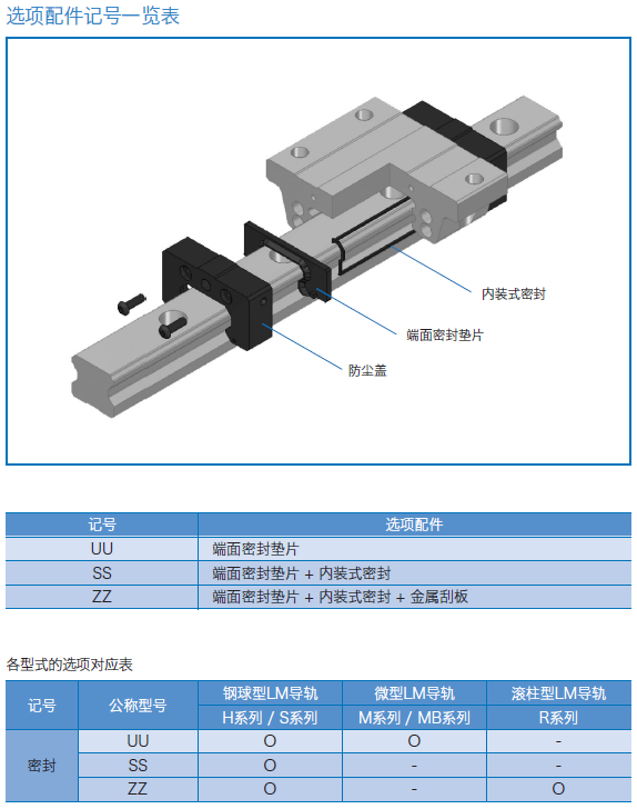 為了極大發(fā)揮直線導(dǎo)軌的特性和性能,防止外部的異物侵入直線運(yùn)動(dòng)系統(tǒng)內(nèi)部,導(dǎo)致異常磨損并縮短使用壽命。預(yù)料可能會(huì)有粉塵及異物侵入時(shí),有必要選擇有效的密封裝置或防塵裝置。